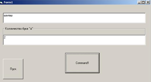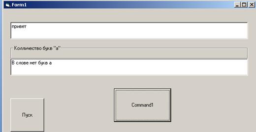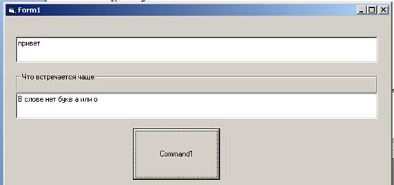 Пример. Составьте программу, выясняющую, какая из букв "а" или "о" встречается в слове Х чаще. Private Sub Command1_Click() x = InputBox("Введите слово") Text1.Text = x Счет_a = 0 Счет_o = 0 For i = 1 To Len(x) If Mid(x, i, 1) = "а" Then Счет_a = Счет_a + 1 If Mid(x, i, 1) = "о" Then Счет_o = Счет_o + 1 Next i If Счет_a = 0 And Счет_o = 0 Then Text2.Text = "В слове нет букв а или о" ElseIf Счет_a > Счет_o Then Text2.Text = "а - встречается чаще" ElseIf Счет_a < Счет_o Then Text2.Text = "o - встречается чаще" ElseIf Счет_a = Счет_o And Счет_a <> 0 Then _ Text2.Text = "одинаково часто встречаются а и о" End IfEnd Sub