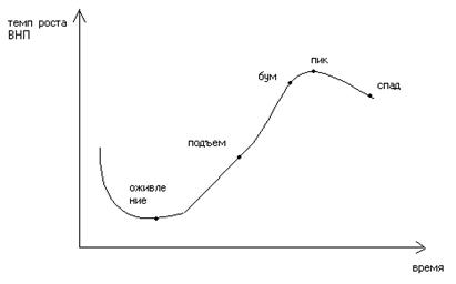 2. Валовой Национальный Продукт (ВВП) включает продукцию и услуги, произведенные непосредственно внутри страны и только с использованием факторов производства данной страны. GIP = GNP – X где GIP – валовой внутренний продукт GNP- валовой национальный продукт Х - чистый экспорт 3. Чистый национальный продукт (ЧНП) представляет собой валовой национальный продукт за вычетом той части произведенного продукта, которая необходима для замены средств производства, изношенных в процессе выпуска продукции (амортизационные отчисления). NNP = GNP – А где NNP- чистый национальный продукт GNP- валовой национальный продукт А- амортизация 4. Личный доход - весь доход, заработанный или полученный отдельными лицами. Он идет на потребление, сбережение, уплату налогов. 5. Располагаемый доход - доход от уплаты налогов + платежи из бюджета. Располагаемый доход непосредственно распределяется на потребление и сбережение. Номинальный и реальный доход Реальный ВНП= номинальный ВНП/ Индекс цен (дефлятор ВНП) * 100% Экономический рост: 1. Реальное приращение объема национального продукта в результате увеличения количества используемых факторов производства или совершенствования техники и технологии; 2. Увеличение реального объема ВНП или реального дохода на душу населения. Теоретически различают следующие типы экономического роста: 1. Интенсивный - увеличение производственного потенциала в результате совершенствования техники и технологии. 2. Экстенсивный - увеличение производственных мощностей в результате увеличения количества используемых факторов производства. 3. Смешанный (реальный) - увеличение производственных мощностей в результате увеличения количества используемых факторов производства и совершенствования техники и технологии. Сбережения - все ресурсы, не идущиена потребление. Экономический рост является составляющей экономического развития, которое представляет собой процесс, включающий периоды роста и спада. Экономический рост - это положительная составляющая экономической динамики. Циклы и кризисы. Обобщенное представление о макроэкономической динамике дает рассмотрение экономических циклов. Экономический цикл характеризует периодические взлеты и падения деловой активности, проявляющиеся во всевозможных формах несоответствия спроса и предложения. Общая картина экономического цикла представляет собой результат сложения колебаний различных показателей экономической активности (темп роста ВНП, общий объем продаж, общий уровень цен, уровень безработицы, загрузка производственных мощностей и др.). Основным свойством цикла является колебание темпа роста ВНП во времени, когда экономическая система проходит четыре последовательные фазы: оживление, подъем, бум, спад.