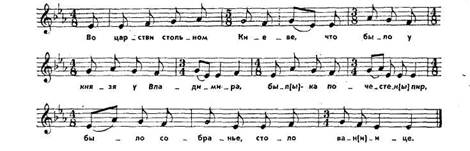 Значительные достижения отечественной музыкальной культуры связаны со становлением и развитием на Руси отдельных княжеств, объединившихся вокруг Киева, Новгорода, Владимира, Суздаля и, наконец, Москвы. В культуре каждого из этих княжеств преломились особенности их исторического развития. Киевская Русь сложилась как могучее государство, объединившее вокруг себя обширные территории. В X веке она вышла на арену мировой истории. Ее столица Киев - один из крупнейших в Европе городов. Вплоть до монголо-татарского нашествия он был экономическим и культурным центром всех славянских земель на Востоке. Небывалой пышности и блеска достигли здесь зодчество, живопись, литература и искусство. Говоря о киевской культуре, нельзя не вспомнить о влиянии на нее Византии, особенно на раннем этапе развития. Киевская Русь оставила потомкам памятники высокой культуры духа и творческого созидания. Одним из них является Софийский собор, воздвигнутый в 1037 году на месте, где Ярослав Мудрый с дружиной одержал победу над печенегами. Украшенный фресками, роскошной мозаикой на золотом фоне, дорогим мрамором, собор поражал современников своей величественной красотой. Софийский собор стал символом расцвета Киевской Руси. Выдающимися литературными документами эпохи явились «Слово о полку Игореве», созданное неизвестным автором в конце XII века, и «Повесть временных лет» *. Музыка неотделима от жизни Киевской Руси. Ее функции ответственны и разнообразны. Она звучала в церкви во время богослужения и в ратных походах, на торжественных церемониях и на народных празднествах. В народном быту продолжали развиваться древние жанры календарных и семейно-бытовых песен. Былины. Самым значительным явлением в музыкальном искусстве Киевской Руси стало рождение новых видов музыкально-поэтического творчества. Одно из них - былинный эпос. Былина в Киевской Руси - героико-эпический жанр. Это одновременно сказка и история. Народ прославлял в былинах отвагу киевских богатырей - защитников родины Ильи Муромца, Добрыни Никитича, Алеши Поповича. Воспевались в них и мирные труженики-хлебопашцы, такие, например, как Микула Селянинович. Создателями былин были художественно одаренные певцы-сказители из среды трудового народа. Поэтому и герои былин - это, прежде всего, выразители дум и чаяний народных. В высшей степени своеобразен музыкальный язык былин - древнейшая музыкальная декламация, в которой большую роль играет импровизационное начало. Исполнитель былины стремился передать тонкие оттенки богатого по содержанию и яркого по образности поэтического текста. Он произносил его нараспев, меняя при этом интонацию, ускоряя и замедляя темп повествования в зависимости от содержания стихов. А поскольку их в былине было много, от исполнителя требовалась большая музыкальная фантазия. Представление о былине может дать следующий пример: