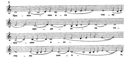 Киевская былина жила и развивалась на протяжении нескольких столетий. Интерес к ней не угас в XIX и XX веках. Об этом свидетельствует не только продолжающаяся деятельность народных сказителей, но и творчество композиторов-профессионалов. Воздействием былинных традиций обусловлен характер многих эпизодов, да и весь художественный замысел таких опер, как «Руслан и Людмила» Глинки, «Князь Игорь» Бородина, «Садко» Римского-Корсакова. К традициям былинного эпоса обращаются и советские композиторы в произведениях, прославляющих героическое прошлое русского народа. Такова, например, кантата «Александр Невский» Прокофьева. Влияние былинной мелодии определило характер одного из очень важных ее эпизодов - «Песни об Александре Невском». Знаменное пение. Другое значительное явление музыкальной культуры Киевской Руси - знаменное пение. Это самый ранний из дошедших до нас образцов письменно зафиксированных русских церковных песнопений. Напомним, что в эпоху средневековья церковь использовала архитектуру, живопись и особенно музыку для утверждения своей власти над духовным миром людей. В церковной службе на Руси именно пение играло большую роль: инструментальная музыка исключалась из обихода (на Западе, как известно, в религиозном обряде широко был представлен орган). Пение не только придавало службе особую пышность, торжественность, но и призвано было формировать мировоззрение людей в религиозном духе. Однако нередко высокоодаренные творцы знаменных напевов, подобно мастерам церковной живописи, вкладывали в музыку настолько глубокое общечеловеческое содержание, что знаменное пение выходило за пределы своей служебной роли и становилось выражением вполне земных чувств и мыслей. Б. В. Асафьев пишет, что музыке знаменных распевов, как и старинным летописям, присуща особая красота языка, то «сурово-сосредоточенного», то «звонкого». В них «та же сфера чувств, та же дисциплина характеров, та же упорная воля жить, тот же мерный ритм, что и в памятниках древнерусского слова, живописи, резьбы и тканей, в образах фресок». Для знаменного пения характерно хоровое одноголосие, так называемая монодия. Движение мелодии поступенное, размеренное, часто основанное на варьировании основной попевки, развитие которой упорно и многократно возвращается к исходному звуку (пример 5). Зародившись в период Киевской Руси, знаменное пение просуществовало несколько столетий. Оно определило многие важные особенности национальной музыкальной культуры. К интонациям знаменного распева обращались русские композиторы, когда стремились воссоздать дух старины и придать музыке характер суровой непреклонности. Так, Римский-Корсаков, создавая тему Ивана Грозного для оперы «Псковитянка», придал ей черты сходства со знаменным напевом.