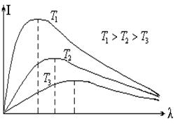 Рис.12.1. Зависимость излучательной способности черного тела от длины волны. Из исследований зависимости интенсивности излучения от длины волны для абсолютно черных тел был установлен закон смещения Вина[1]. (рис.12.1):