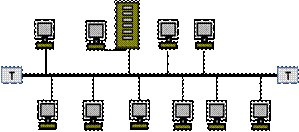 В сети с топологией шина данные в виде электрического сигнала передаются всем компьютерам сети, но принимает их тот, адрес которого совпадает с адресом получателя, зашифрованном в этих сигналах. Причем в каждый момент времени передачу может вести только один компьютер. Поэтому производительность такой сети зависит от количества компьютеров, подключенных к шине. Чем больше компьютеров, ожидающих передачи данных, тем медленнее сеть. Рис.4.6 Топология «Шина».
