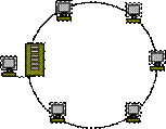 Компьютеры подключаются к кабелю, замкнутому в кольцо. Сигналы передаются по кольцу в одном направлении и проходят через каждый компьютер. В отличие от пассивной топологии шина, здесь каждый компьютер выступает в роли репитера (повторителя), усиливая сигналы и передавая их следующему компьютеру. Репитер ( повторитель ) - устройство, обеспечивающее сохранение формы и амплитуды сигнала при передаче его на большее, чем предусмотрено данным типом физической передающей среды расстояние. Рис.4.7 Топология «Кольцо».