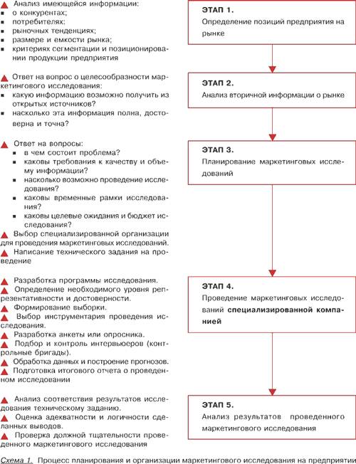 Приложения. В приложения включаются материалы, которые слишком сложны, слишком детализированы, являются слишком специальными или не абсолютно необходимыми в основном тексте отчета. В большинстве случаев в приложения помещается в качестве иллюстрации копия опросной анкеты или форма регистрации наблюдений, использовавшаяся для сбора данных. Приложение может также включать в себя карты, использовавшиеся при определении выборки, а также любые детальные расчеты, выполнявшиеся в поддержку определения объема выборки и разработки ее плана. Приложения могут включать детальные расчеты статистик проверки, а зачастую и подробные таблицы, с помощью которых были составлены обзорные таблицы, вошедшие в основную часть отчета. Организация проведения маркетинговых исследований. Процесс подготовки и проведения исследования рынка можно представить в виде этапов (схема 1). Следуя принятой терминологии, этапы 1 и 2 можно условно назвать "анализом рынка", поскольку они проводятся силами самой организации и основаны на анализе имеющейся внутренней информации, а также информации, полученной из открытых источников. Этап 1. Определение позиций предприятия на рынке. Прежде всего, важно выяснить, каковы позиции предприятия на рынке, поскольку именно они и определяют области, которые необходимо исследовать. Схематически это выглядит следующим образом (схема 2).
