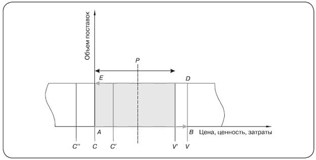 Рис. 6.5. Модель конфликта между партнерами Примечание: С — общие затраты продавца; С' — затраты продавца, скорректированные на величину дополнительных издержек; V — полная ценность покупателя; V' — затраты покупателя, скорректированные на величину дополнительных издержек. Соглашение о цене лежит в диапазоне от С до V'. В-третьих, рыночная сила каждой из сторон может быть разная, причем как реальная, так и позиционируемая — в зависимости от таланта переговорщиков. На рис. 6.5 изображена ситуация, демонстрирующая конфликт вокруг прибыли между парой «продавец — покупатель». Каждый из партнеров будет стремиться установить цену исходя из своих интересов (продавец — в сторону увеличения, покупатель — уменьшения). В реальной ситуации компании сталкиваются с еще большим количеством условий, самые распространенные из которых — условия поставок, оплаты, страхования и контроля качества продукции. Данные издержки могут быть распределены в разных пропорциях между сторонами, также на контрактной основе может быть привлечена третья сторона. Дополнительные издержки несет та сторона, которая оценивает эти издержки как более низкие. Так, издержки по пользованию кредитом (независимо от того, имеет ли он форму денежного кредита в виде предоплаты или товарного кредита в виде отсрочки платежа) должна нести та компания, для которой стоимость денег меньше; аналогично и с другими издержками. В рассматриваемой нами гипотетической ситуации очевидно, что издержки выгоднее нести покупателю (при допущении, что издержки нельзя разделить или передать третьей стороне)2. В результате остается нераспределенная прибыль, которая рассчитывается как произведение величины разницы ценности для покупателя V и затрат поставщика С и объема поставки AE. На рис. 1 она представлена выделенным цветом прямоугольником. В случае, когда компании делят прибыль на основе факторов рыночной силы, отталкиваясь от «отправной цены», будем использовать понятие «конкурентная стратегия взаимоотношений». В этом случае стороны несут относительно небольшие ex ante издержки и на втором шаге (при повторной закупке) фактически становятся перед тем же выбором, т.е. затраты на смену поставщика являются минимальными — не блокируют возможность покупателя сменить этого поставщика. Таким образом, компании открыто соревнуются (конкурируют) за прибыль, что и дало название данной стратегии. В работе Н. Кэмпбелла, который одним из первых попытался классифицировать закупочные стратегии, конкурентные отношения относятся к независимым (переговорщики не зависят друг от друга и устанавливают цену, опираясь на объективные факторы силы сторон), что соответствует нашей логике [Campbell, 2002, p. 390]. Конкурентные отношения типичны для компаний, приобретающих (продающих) стандартизированные материалы и имеющих множество альтернативных поставщиков (клиентов). На рынке B2C конкурентные отношения возникают не реже. Например, домохозяйки — покупательницы домашних принадлежностей типа алюминиевой фольги, пищевой пленки каждый раз при покупке заново оценивают характеристики продуктов, так как в данном случае им проще опять потратить время на изучение характеристик, нежели вспомнить, что они выбрали в прошлый раз. Конкурентные отношения характеризуются не только низкими издержками на переключение, но и вы