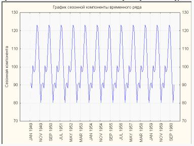 Рисунок 3. График сезонной компоненты временного ряда. Периодическая и сезонная зависимость (сезонность) представляет собой другой общий тип компонент временного ряда. Это понятие было проиллюстрировано ранее на примере авиаперевозок пассажиров. Можно легко видеть, что каждое наблюдение очень похоже на соседнее; дополнительно, имеется повторяющаяся сезонная составляющая, это означает, что каждое наблюдение также похоже на наблюдение, имевшееся в том же самом месяце год назад. В общем, периодическая зависимость может быть формально определена как корреляционная зависимость порядка k между каждым i-м элементом ряда и (ik)-м элементом. Ее можно измерить с помощью автокорреляции (т.е. корреляции между самими членами ряда); k обычно называют лагом (иногда используют эквивалентные термины: сдвиг, запаздывание). Если ошибка измерения не слишком большая, то сезонность можно определить визуально, рассматривая поведение членов ряда через каждые k временных единиц. Автокорреляционная коррелограмма. Сезонные составляющие временного ряда могут быть найдены с помощью коррелограммы. Коррелограмма (автокоррелограмма) показывает численно и графически автокорреляционную функцию (AКФ), иными словами коэффициенты автокорреляции (и их стандартные ошибки) для последовательности лагов из определенного диапазона (например, от 1 до 30). На коррелограмме обычно отмечается диапазон в размере двух стандартных ошибок на каждом лаге, однако обычно величина автокорреляции более интересна, чем ее надежность, потому, что интерес в основном представляют очень сильные (а, следовательно, высоко значимые) автокорреляции. Исследование коррелограмм. При изучении коррелограмм следует помнить, что автокорреляции последовательных лагов формально зависимы между собой. Рассмотрим следующий пример. Если первый член ряда тесно связан со вторым, а второй с третьим, то первый элемент должен также каким-то образом зависеть от третьего и т.д. Это приводит к тому, что периодическая зависимость может существенно измениться после удаления автокорреляций первого порядка, т.е. после взятия разности с лагом 1. Взятие разности также удаляет тренд, который обычно подавляет другие автокорреляции. Например, если имеется устойчивый линейный тренд, как в ряде авиаперевозок, то каждое наблюдение в большой степени является линейной функцией предыдущего наблюдения. Частные автокорреляции. Другой полезный метод исследования периодичности состоит в исследовании частной автокорреляционной функции (ЧАКФ), представляющей собой углубление понятия обычной автокорреляционной функции. В ЧАКФ устраняется зависимость между промежуточными наблюдениями (наблюдениями внутри лага). Другими словами, частная автокорреляция на данном лаге аналогична обычной автокорреляции, за исключением того, что при вычислении из нее удаляется влияние автокорреляций с меньшими лагами. На лаге 1 (когда нет промежуточных элементов внутри лага), частная автокорреляция равна, очевидно, обычной автокорреляции. На самом деле, частная автокорреляция дает более чистую картину периодических зависимостей. Удаление периодической зависимости. Как отмечалось выше, периодическая составляющая для данного лага k может быть удалена взятием разности соответствующего порядка. Это означает, что из каждого i-го эле