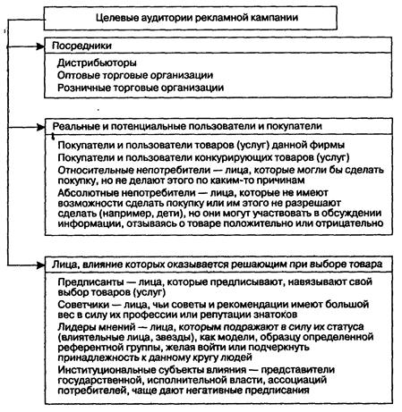 Выбор целевой аудитории. Целевая аудитория – это основная и наиболее важная для фирмы категория субъектов коммуникации, получателей обращения, которая включает потенциальных покупателей продвигаемого товара и референтные группы. Референтная группа – круг лиц, оказывающих прямое или косвенное влияние на отношение или поведение человека. Конкретизация целевой аудитории помогает определить стиль и тему рекламы, каналы распространения информации, которые будут использоваться для передачи рекламного обращения. Выбор целевой аудитории зависит от целей рекламы, стратегии охвата рынка, каналов распределения товара. Признаки сегментирования, используемые при разработке комплекса маркетинга, могут быть полезными в описании целевой аудитории. Целевой аудиторией рекламной кампании выступают отдельные субъекты маркетинговой коммуникации (рис.).