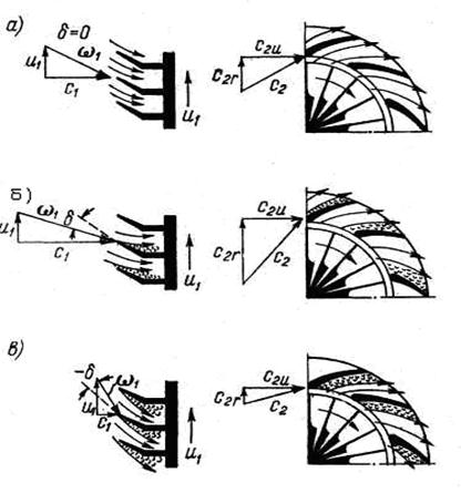 Неустойчивость работы выражается в появлении вибраций лопаток и всего компрессора, усилении шума и возникновении пульсаций воздуха; в некоторых случаях наблюдается выброс воздуха во всасывающий патрубок. Все эти явления, характеризующие неустойчивую работу компрессора, принято называть помпажем. Границу помпажа, или границу устойчивой работы компрессора можно получить, определив для каждого числа оборотов режим, когда появляется помпаж, и соединив точки, характеризующие эти режимы, плавной кривой. Рабочие режимы компрессора располагаются вправо от границы помпажа; слева от нее устойчивая работа компрессора невозможна. Таким образом, граница помпажа устанавливает допустимую область эксплуатационных режимов работы компрессора. Необходимо выяснить, хотя бы в общих чертах, причины, которые вызывают неустойчивую работу компрессора. Установлено, что явление помпажа обусловлено особенностями обтекания воздухом проточной части компрессора. Помпаж является следствием воздействия периодических срывов потока с передних кромок лопаток рабочего колеса и диффузора, сопровождающихся расширяющейся областью вихреобразования. Срыв потока объясняется тем, что на нерасчетных режимах работы компрессора направление относительной скорости воздуха не совпадает с направлением передних кромок лопатки. Однако не всякий срыв потока приводит к помпажу. Чтобы выяснить условия появления помпажа, рассмотрим три характерных случая работы компрессора при постоянном числе оборотов (п = const, а следовательно, и и = const): 1) объемный расход воздуха равен расчетному (QB = QBP); 2) объемный расход воздуха больше расчетного,(QВ > QBP); 3) объемный расход воздуха меньше расчетного (QB <QBP). Обратимся к графикам на рис. 8.8, иллюстрирующим условия обтекания рабочих лопаток и лопаточного диффузора компрессора в перечисленных случаях. Рис. 8.8, а соответствует расчетному режиму (QB = QBP), когда сохраняется соответствие между направлением вектора относительной скорости