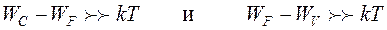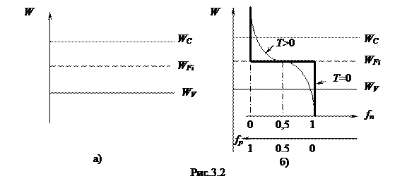 При Т = 0 функция Ферми для электронов для всех значений W > WF будет равна нулю. Значит, при Т = 0 ни один уровень с энергией большей энергии Ферми не будет занят электронами. Мы уже знаем, что при температуре абсолютного нуля все уровни зоны проводимости будут свободны. Отсюда можно сделать вывод, что все уровни зоны проводимости лежат выше уровня Ферми. Для всех значений W < WF функция Ферми при Т = 0 обращается в единицу. Это в свою очередь означает, что все уровни с энергиями W, меньшими, чем энергия Ферми, будут заняты электронами. Действительно, в этих условиях полностью заняты все уровни в валентной зоне. Следовательно, все уровни валентной зоны лежат ниже уровня Ферми. Это значит, что уровень Ферми расположен ниже свободной и выше валентной зоны, то есть в запрещенной зоне. Далее мы увидим, что в собственном (беспримесном) полупроводнике уровень Ферми располагается вблизи середины запрещенной зоны. При Т = 0 положение уровня Ферми WFi показано на рис.3.2,а, где WC – нижняя граница (дно) зоны проводимости, WV – верхняя граница (потолок) валентной зоны. Вид функции Ферми при Т = 0 изображен на рис.3.5,б в виде ступеньки. С повышением температуры функция Ферми превращается в плавную кривую. Вероятность нахождения электрона в зоне проводимости становится отличной от нуля. Нас не должно смущать, что значениям энергий, лежащим в запрещенной зоне, соответствуют некоторые значения функции Ферми. Это вовсе не означает, что электроны могут располагаться на уровнях в запрещенной зоне. Мы имеем право пользоваться функцией Ферми только на тех участках, где имеются уровни, разрешенные для электронов. Положение уровня Ферми в запрещенной зоне можно характеризовать энергетическим состоянием его от границ разрешенных зон:
