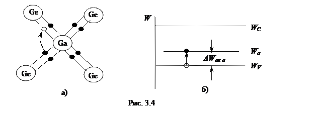 Рассмотрим теперь случай, когда в кристаллическую решетку германия вводится элемент III группы системы Менделеева, например, галлий. Внешняя энергетическая оболочка его содержит три электрона. В решетке германия атом галлия образует только три заполненные ковалентные связи. Четвертая связь оказывается незаполненной (рис. 3.4,а). При небольшом тепловом возбуждении электрон одной из соседних заполненных ковалентных связей может перейти в эту связь.
