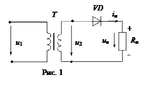 При подаче переменного синусоидального напряжения на первичную обмотку согласующего трансформатора напряжение на зажимах вторичной его обмотки будет также переменным синусоидальным, т. е. Диод проводит электрический ток только в том случае, когда его анод относительно катода имеет положительный потенциал. Поэтому ток в цепи протекает только в одном направлении, т. е. в течение одной половины периода переменного напряжения. В результате этого ток в цепи нагрузки оказывается пульсирующим (неизменным по направлению, но изменяющимся по значению) (рис.2). При этом амплитудное значение тока