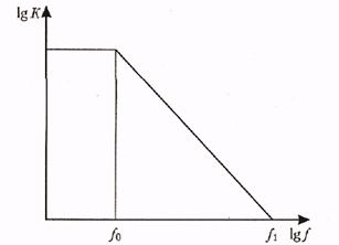 - Разность входных токов При больших сопротивлениях резисторов, включенных на входах ОУ, за счет разности входных токов может появиться паразитный дифференциальный сигнал. - Частота единичного усиления f 1 характеризует частотные свойства ОУ в режиме усиления малых сигналов. Это та частота, на которой коэффициент усиления напряжения становится равным единице. В ОУ предусмотрено включение корректирующих цепочек с тем, чтобы устранить самовозбуждение на высоких частотах, неизбежно возникающее при больших коэффициентах усиления и охвате ОУ обратной связью. Поэтому частотная характеристика ОУ имеет специфичный вид (рис. 7.16). Если рассматривать зависимость логарифма коэффициента усиления как функцию логарифма частоты, то, начиная с некоторой частоты f 0, наблюдается линейное уменьшение lg K вплоть до частоты f 1, на которой К = 1, а lg K =0. Практически f 0 = 10-20 Гц, f 1 = 0,5-5 МГц.