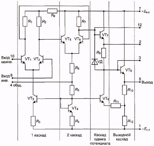 Рис. 7.17 Схемотехника ОУ В состав ОУ входит несколько каскадов. Наиболее простое схемное решение имеет ОУ К140УД1 (рис. 7.18), изготовленный на кремневой пластине размером 1,1 х 1,1 мм и содержащий 9 транзисторов. Входной дифференциальный каскад выполнен на транзисторах VT1 и VT2, он питается от генератора стабильного тока на транзисторах VТ3 и VT4 Второй дифференциальный каскад выполнен на транзисторах VT5 и VT6. Схема сдвига потенциала образована транзистором VT7, резистором R9 и генератором стабильного тока VT8. Выходной каскад на транзисторе VT9 представляет собой эмиттерный повторитель, охваченный неглубокой положительной обратной связью, компенсирующей ослабление сигнала схемой сдвига потенциала. Обратная связь осуществляется путем подачи части выходного сигнала на эмиттер VT8, который включен для этого сигнала по схеме с ОБ, и затем на базу эмиттерного повторителя VT9. Схема обеспечивает сравнительно невысокий коэффициент усиления К u = 2 х 103, дает ослабление синфазного сигнала Косл.сф. = 60 дБ и имеет невысокое входное сопротивление Rвх = 4 кОм.