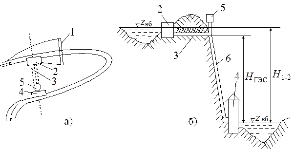 Деривационная схема концентрации напора обычно применяется на горных реках с большими уклонами (рис. 3.2). Плотина 1 создает небольшой подпор и сравнительно малое водохранилище, из которого через водоприемник 2 вода направляется в деривацию 3, представляющую собой искусственный водовод, выполненный в виде открытого канала или туннеля (для безнапорной деривации) или закрытого трубопровода (для напорной деривации). Вода из деривации поступает по напорным трубопроводам 6 к турбинам ГЭС 4. Таким образом, напор создается не плотиной, а деривацией. Если деривация напорная, то в конце ее для смягчения возможных при нестационарных режимах гидравлических ударов сооружается уравнительный резервуар 5. Напор для деривационной ГЭС, как и при плотинной схеме, меньше напора используемого участка реки, что связано с его потерями в деривации и напорном трубопроводе.