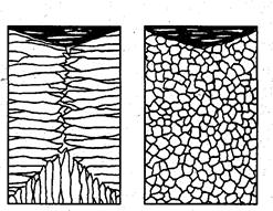а б Рис. 3.10. Схемы макроструктур слитков: а – столбчатые кристаллы; б – равноосные кристаллы Например, перегрев сплавов перед разливкой и быстрое охлаждение при кристаллизации приводят к формированию структуры, состоящей практически из одних столбчатых кристаллов (рис.3.10а). Такая структура называется транскристаллической. Подобную структуру имеют слитки очень чистых металлов. Зона столбчатых кристаллов характеризуется наибольшей плотностью, но в месте стыка столбчатых кристаллов собираются нерастворимые примеси, и слитки с транскристаллической структурой часто растрескиваются. Транскристаллическая структура в сварных швах уменьшает прочность. На практике для измельчения структуры металлов и сплавов широко применяют технологическую операцию, называемую модифицированием. Она состоит во введении в жидкий сплав перед разливкой специальных добавок (модификаторов). В качестве модификаторов используют поверхностно-активные вещества (например, бор в стали, натрий в алюминии и его сплавах) и элементы, образующие тугоплавкие тонкодисперсионные частицы (например, титан, цирконий в алюминии и его сплавах; алюминий, титан в стали). Модификаторы добавляют в сплавы в количествах от тысячных до десятых долей процента. Слитки сплавов имеют неоднородный состав. Неоднородность сплава по химическому составу, структуре и неметаллическим включениям, образующаяся при кристаллизации слитка, называется ликвацией. Химическая неоднородность по отдельным зонам слитка называется зональной ликвацией. Она отрицательно влияет на механические свойства. В реальных слитках помимо зональной встречаются и другие виды ликвации: внеосевая, дендритная, карбидная, подусадочная, угловая, гравитационная. Так, гравитационная ликвация образуется в результате разницы в удельных весах твердой и жидкой фаз, а также при кристаллизации несмешивающихся жидких фаз. Жидкий металл имеет больший объём, чем закристаллизовавшийся, поэтому залитый в форму металл в процессе кристаллизации сокращается в объёме, что приводит к образованию пустот, называемых усадочными раковинами. Усадочные раковины могут быть сконцентрированы в одном месте, либо рассеяны по всему объёму слитка или по его части. Они могут быть заполнены газами, растворимыми в жидком металле, но выделяющимися при кристаллизации. В хорошо раскисленной, так называемой спокойной стали, отлитой в изложницу с утепленной подложкой, усадочная раковина образуется в верхней части слитка и в объёме всего слитка содержится малое количество газовых пузырей и раковин. Недостаточно раскисленная, так называемая кипящая сталь, содержит раковины и пузыри во всем объёме. Поэтому спокойный металл более плотный, чем кипящий.