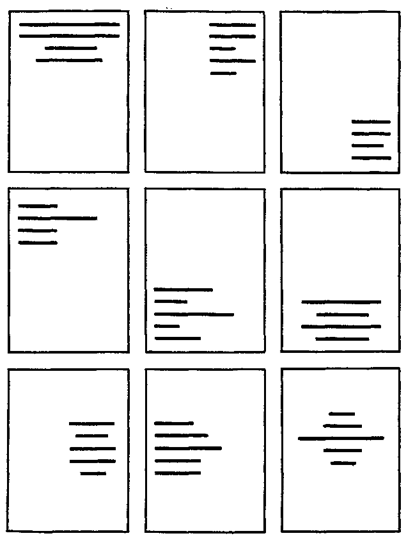 Рис 7.3. Возможные варианты расположения текста акциденции на полосе Иногда в целях большей выразительности, особенно при оформлении малых акцидентных форм, афишно-плакатных и рекламных изданий, элементы композиции могут располагаться в самых неожиданных местах (рис. 7.4). При этом определяется главный элемент композиции — композиционный центр, наиболее важный в смысловом отношении, который помогает сразу определить суть издания, понять его содержание. Он должен заметно выделяться своими размерами, цветом, обрамлением или другими средствами среди прочего изобразительного материала. Таким центром при построении композиции может быть иллюстрация или шрифтовая строка, которая должна быть расположена в середине, на самом видном месте. При этом мы сталкиваемся с одной из зрительных иллюзий — оптический центр полосы (рис. 7.5а) располагается выше геометрического (рис. 7.5б) (если разделить полосу на восемь частей, то оптическая середина должна разделить полосу на 3/8 части вверху и на 5/8 — внизу). Учитывая эту оптическую иллюзию, самое большое поле на странице — нижнее.