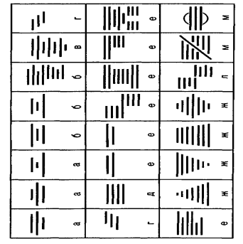 Рис. 7.8. Пример оптической иллюзии изменения размеров изображения в зависимости от размера окружающих пробелов Соразмерность главных и второстепенных элементов между собой в композиции определяется смысловым содержанием, при этом элементы композиции по их важности не следует подразделять более чем на три группы. Композиция из четырех и более составных частей выглядит слишком сложной и дробной. Композиция акцидентной формы — это также правильное сочетание различных элементов (шрифта, линеек, орнаментов, иллюстраций, пробельных элементов) между собой и удачное расположение их в формате. Определяющим фактором при этом является единство формы и содержания, для чего должно выдерживаться определенное стилевое единство шрифтов, линеек, иллюстраций и орнаментов. Так, при выборе контрастных шрифтов для набора акциденции выбирают контрастные линейки (например, четырехпунктовые жирные в сочетании с тонкими) и высококонтрастные орнаменты, при этом единство стиля тем выше, чем ближе толщина основных и соединительных штрихов шрифта к толщине жирных и тонких линеек и орнаментов. Шрифты умеренной контрастности хорошо сочетаются с полужирными двухпунктовыми линейками и орнаментом полужирного начертания. Малоконтрастные шрифты, особенно полужирного начертания, хорошо сочетаются с двухпунктовыми жирными, а при крупнокегельном наборе и с четырехпунктовыми жирными линейками и орнаментом в негативном изображении. Группировка строк в акцидентном наборе (рис. 7.9) производится по смыслу текстовой информации и с учетом некоторых композиционных правил. Существует много способов группировки строк, одни из которых применяются чаще, другие реже (рис. 7.9, а, б). Наиболее частое применение находит так называемая открытая группировка, при которой все строки выключаются посередине формата набора (в красную строку). Классической считается открытая трехстрочная группировка, при которой средняя строка самая длинная, а две другие — заметно разные по длине. Ступенчатая группировка строк (рис. 7.9, г) характеризуется расположением строк одинакового формата с одинаковыми отступами друг от друга. Ступенчатая группировка чаще всего применяется в объявлениях, афишах, аншлагах и т.д. Блочная, или закрытая, группировка строк образуется из двух или более строк одинакового формата. Можно использовать и четыре строки двух разных форматов; первая и последняя строки при наличии двух полноформатных могут быть заметно меньше, но незначительная разница в форматах строк создает неряшливый вид. Блочная группировка может быть симметричной (рис. 7.9 д) и ассиметричной (рис. 7.9, е) При фигурной группировке строки образуют треугольник, ромб, трапецию или другую геометрическую фигуру (рис. 7.9, ж). Смешанная группировка строк предполагает смешение трехступенчатой группировки с блочной (рис. 7.9, л) и равнение строк по одной вертикали (левой, правой или по центральной оси). Указанный вид группировки строк более удобен, поскольку формат строк не имеет особого значения. Применяется также группировка строк с косыми и овальными элементами (рис. 7.9, м), чаще при оформлении акциденции малых форм. Иногда группируют строки меньшего кегля с подключкой их к строке большего кегля. Как уже отмечалось ранее, пробелы на полосе, между строками и внутри строк выполняют также важную компо