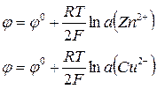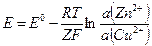 а в цепи при ее замыкании - электрический ток. Источник тока совершает работу: во внешней цепи перенос электронов, во внутренней - перенос ионов. Уравнение Нернста для процесса в элементе Даниэля – Якоби: где Z – число электронов, переносимое при протекании одного акта реакции (I), а E0 (= 0,916 В) – разность стандартных электродных потенциалов. Уравнение Нернста можно применить не только к гальваническому элементу, но и к составляющим его электродам. Уравнение Нернста для цинкового и медного электродов может быть записано соответственно как