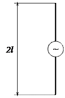 Любая антенна представляет собой открытый колебательный контур, настроенный на заданную частоту. Простейшей антенной является симметричный вибратор. Симметричный вибратор представляет собой проводник, изолированный с обоих концов. В центральную часть этого проводника включен источник тока высокой частоты. Питание симметричного вибратора обычно производится с помощью симметричной фидерной линии. Симметричный вибратор может быть получен из разомкнутой двухпроводной линии при разведении ее концов на 180º. При сложении падающей и отраженной волн в разомкнутой линии устанавливаются стоячие волны. В тех точках линии, где амплитуда напряжения равна нулю, амплитуда тока максимальна, а в точках с максимальной амплитудой напряжения амплитуда тока равна нулю. Расстояние вдоль линии между нулевой амплитудой тока и нулевой амплитудой напряжения равно одной четверти длины волны. Поэтому для работы на собственной частоте λ0 длина каждой половины симметричного вибратора должна быть равна четверти длины волны. При этом полная длина антенны (2l) равна половине длины волны. Симметричный вибратор с такими размерами называется полуволновым вибратором. Схема полуволнового симметричного вибратора приведена на рис. 3.4.1.