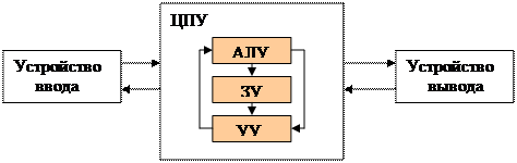 В конце 40-х годов Нейман изложил основные принципы построения компьютера. В основном, эти принципы сохранились и в настоящее время. Компьютер, основанный на принципах Неймана должен состоять из следующих устройств: - арифметико-логического устройства (АЛУ) для выполнения вычислительных и логических операций; - устройства управления (УУ) для организации процесса выполнения программ; - запоминающего устройства, или памяти, для хранения программ и данных; - внешних устройств ввода-вывода информации (УВВ) С помощью внешних устройств в память компьютера вводятся программы и данные для обработки. По команде оператора с клавиатуры устройство управления считывает содержащиеся в памяти программы и данные и передает их в АЛУ. Результат обработки УУ записывает в память и передает их на внешние устройства (монитор, принтер). Структурная схема компьютера приведена на рис. 5.1.