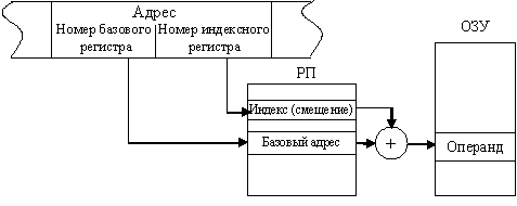Для задания базового адреса и смещения могут применяться ранее рассмотренные способы адресации. Как правило, базовый адрес находится в одном из регистров регистровой памяти, а смещение может быть задано в самой команде или регистре.