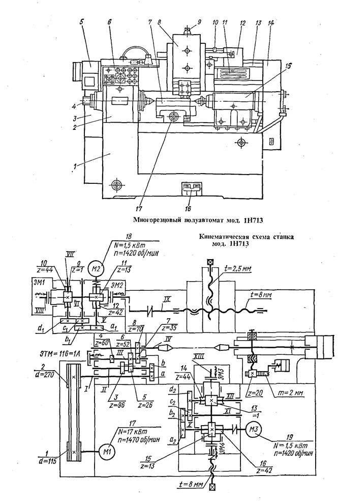 Общий вид станка. На нижней станине 1 установлена передняя бабка 2 с механизмом главного движения и шпинделем 4. По продольным направляющим нижней станины можно перемещать заднюю бабку 15, а по поперечным направляющим — поперечный суппорт 7 с механизмом подач. На верхней станине 13 закреплена коробка подач 5 продольного суппорта 8, который перемещается по направляющим станины. На передней панели бабки расположен щиток 6 с кнопками управления станком. Справа от продольного суппорта смонтированы передвижной кронштейн копирной линейки 12, командоаппарат 11 для управления циклом работы продольного суппорта и передвижной упор 10 для установки в рабочее положение линейки отскока продольного суппорта. Квадратными рукоятками 9 и 17 настраивают соответственно ползуны продольного 8 и поперечного 7 суппортов. Педалью 16 управляют работой пневмосистемы задней бабки. Ременная передача механизма главного движения закрыта кожухом 3. Электрооборудование станка расположено в шкафу 14, а пневмоаппаратура — в корпусе станины. Электродвигатель главного движения находится внутри станины под передней бабкой. Кинематическая схема станка. От электродвигателя 17 через клиноременную передачу 1—2, вал 1, сменные зубчатые колеса а — б, вал II, зубчатые колеса 3 — 4 или 5 — 6, вал III и зубчатые колеса 7 — 8 вращение передается шпинделю IV. Движения подачи продольного и поперечного суппортов осуществляются от автономных коробок подач (АКП-2). Рабочее движение продольного суппорта осуществляется по цепи: электродвигатель 18, гитара сменных колес червячная передача 9 — 10, муфта ЭМ1, ходовой винт IX, суппорт. Быстрое перемещение продольного суппорта осуществляется по цепи: электродвигатель 18, вал V, винтовая зубчатая передача 11—12, муфта ЭМ2, ходовой винт IX, суппорт. Рабочее движение поперечного суппорта осуществляется по цепи: электродвигатель 19, гитара сменных колес, червячная передача 13 — 14, муфта ЭМЗ, вал XIII, ходовой винт, суппорт. Быстрое перемещение поперечного суппорта осуществляется по цепи: электродвигатель 19, вал X, винтовая зубчатая передача 15 — 16, муфта ЭМ4, вал XIII, ходовой винт, суппорт.