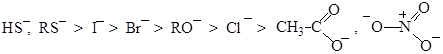 Порядок реакционной способности нуклеофилов в протонных растворителях следующий:
