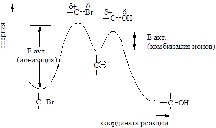 Скорость реакции зависит только от концентрации бромистого алкила и подчиняется уравнению первого порядка v = k[(CH3)3СBr]. Энергетический профиль реакции SN1 имеет следующий вид: