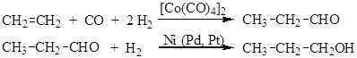 3. Процесс оксосинтеза. Реакция открыта Реленом в 1938 г. Назначение процесса – получение из алкенов и синтез-газа (СО+Н2) альдегидов и их гидрирование до спиртов:
