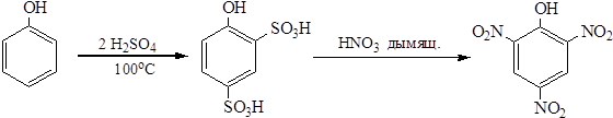 Эта реакция идет с саморазогреванием. Пикриновую кислоту получают также через стадию сульфирования. Для этого обрабатывают фенол при 100°С избыточным количеством серной кислоты, получают 2,4-дисульфопроизводное, которое не выделяя из реакционной меси обрабатывают дымящей азотной кислотой: