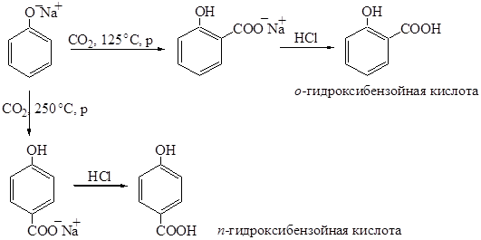 Последний используют для получения эпоксисоединений. Реакция Кольбе – Шмидта. Синтез фенилкарбоновых кислот. Феноляты натрия и калия реагируют с углекислым газом, образуя в зависимости от температуры орто- или пара-изомеры фенилкарбоновых кислот: