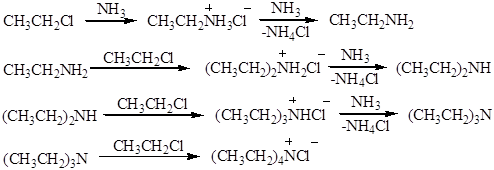 Аммонолиз галогенпроизводных относится к реакциям нуклеофильного замещения. В частности, реакция СН3СН2Сl с NН3 протекает по механизму SN2: