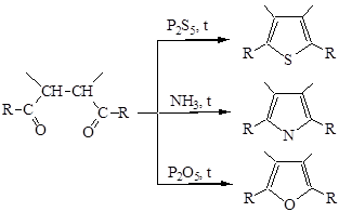 4) Реакция Пааля – Кнорре (циклизация дикарбонильных соединений). Пятичленные гетероциклы и большинство их замещенных могут быть получены циклизацией дикарбонильных соединений.