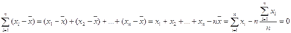 1. Сумма отклонений индивидуальных значений признака от его среднего значения равна нулю. Доказательство: