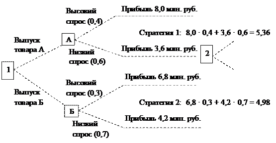Как показывают расчеты, первая стратегия предоставляет возможность получения большего значения ожидаемого дохода и является предпочтительной по сравнению с альтернативным вариантом. Дерево решений – это схематическое представление проблемы принятия решений. Как и платежная матрица, дерево решений дает руководителю возможность учесть различные альтернативные направления действий и соотнести ожидаемые финансовые результаты с вероятностью их достижения, а затем сравнить альтернативы. С помощью дерева решений можно построить более сложную ситуацию, когда результаты одного решения влияют на выбор последующих управленческих решений. В рамках данного метода также рассчитывается ожидаемое значение альтернативы, позволяющее выбрать лучший вариант решения. Примером использования дерева решений может быть ситуация по выбору стратегии о расширении производства различных видов товаров с учетом ожидаемого роста спроса на них (рис. 34).