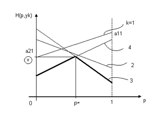 Выигрыш 1-го игрока H(p,yk)=p1a1k + p2a2k = p1a1k + (1-p1)a2k, На плоскости такая зависимость изображается отрезком прямой, причем при p=0 H(p,yk)=a2k, p=1 H(p,yk)=a1k Таким образом, получаем семейство из n прямых: