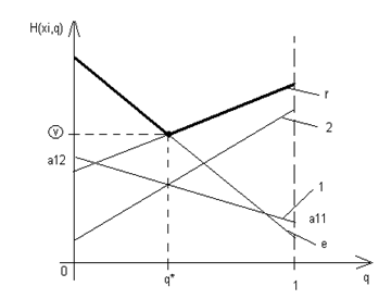 Исходя из разумности поведения 1-ого игрока, проигрыш 2-ого определяется верхней огибающей семейства этих прямых. Значения q* и v находятся как абсцисса и ордината нижней вершины огибающей, а затем оптимальная стратегия 1-го игрока определяется исходя из его рабочих стратегий (в данном случае рабочими стратегиями 1-го игрока являются xr и xe), аналогично предыдущему случаю. Во всех этих случаях число рабочих стратегий обоих игроков одинаково.