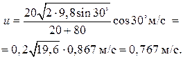Пример 3. Ящик массой m 1 = 20 кг соскальзывает по идеально гладкому лотку длиной l = 2 м на неподвижную тележку с песком и застревает в нем. Тележка с песком массой m 2 = 80 кг может свободно (без трения) перемещаться по рельсам в горизонтальном направлении. Определить скорость и тележки с ящиком, если лоток наклонен под углом α =