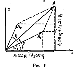 Начальную фазу результирующего колебания можно также определить непосредственно из векторной диаграммы (рис. 6):