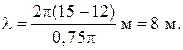 Пример 14. Плоская волна распространяется вдоль прямой со скоростью v = 20 м/с. Две точки, находящиеся на этой прямой на расстояниях x 1 = 12 м и х 2 = 15 м от источника волн, колеблются с разностью фаз Δφ = 0,75π. Найти длину волны λ, написать уравнение волны и найти смещение указанных точек в момент t = 1,2 с, если амплитуда колебаний A = 0,1 м. Решение. Точки, находящиеся друг от друга на расстоянии, равном длине волны λ, колеблются с разностью фаз, равной 2π; точки, находящиеся друг от друга на любом расстоянии Δ x, колеблются с разностью фаз, равной