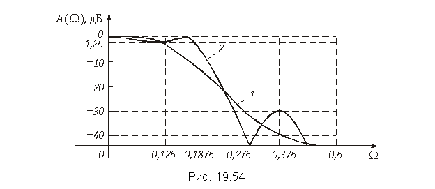 Пример. Найдем импульсную характеристику h (k) фильтра нижних частот, имеющего граничную частоту полосы пропускания W = 0,1, и АЧХ, приведенную на рис. 19.55. Импульсную характеристику будем рассчитывать для значения N = 30.