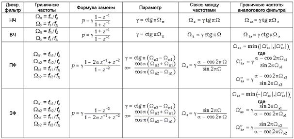 Синтез дискретных фильтров верхних частот, полосовых и режекторных. Требования к любому типу фильтра преобразуются в требования к аналоговому ФНЧ-прототипу. Затем рассчитывается аналоговый прототип, как это показано выше, и с помощью замены переменных переходят от H (p) к H (z).