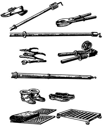 По своему назначению средства защиты условно разделяют на изолирующие, ограждающие и вспомогательные. К изолирующим электрозащитным средствам (рисунок 14.4) относятся: · изолирующие штанги; · изолирующие и электроизмерительные клещи; · указатели напряжения; · диэлектрические перчатки; · слесарно-монтажный инструмент с изолирующими рукоятками. · диэлектрические галоши; Рисунок 14.4. – Изолирующие · диэлектрические ковры. защитные средства К ограждающим электрозащитным средствам относятся: · щиты; · оградительные устройства; · изолирующие подставки и накладки; · барьеры; · ограждения-клетки; · временные переносные заземления и др. К вспомогательным электрозащитным средствам относятся: · предохранительные пояса; · лестницы; · когти; · защитные очки; · рукавицы и щиты; · плакаты и знаки безопасности.