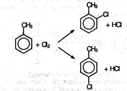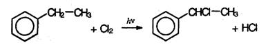 Гомологи бензола имеют ряд отличных от бензола химических свойств, связанных со взаимным влиянием алкильного радикала и бензольного кольца. Реакции в боковой цепи. По химическим свойствам алкильные радикалы подобны алканам. Атомы водорода в них замещаются на галоген по радикальному механизму (SR). Поэтому в отсутствие катализатора при нагревании или УФ облучении идет радикальная