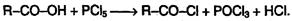 Отличие карбоновых кислот от минеральных заключается в возможности образования ряда функциональных производных. 2. Образование функциональных производных карбоновых кислот. При замещении группы ОН в карбоновых кислотах различными группами (X) образуются функциональные производные кислот, имеющие общую формулу R–CO–X; здесь R обозначает алкильную либо арильную группу. Хотя нитрилы имеют другую общую формулу (R–CN), обычно их также рассматривают как производные карбоновых кислот, поскольку они могут быть получены из этих кислот. Хлорангидриды получают действием хлорида фосфора (V) на кислоты: