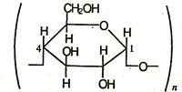 Молекулы полисахаридов можно рассматривать как продукт поликонденсации моносахаридов. Общая формула полисахаридов (С6Н10О5)n. Мы рассмотрим важнейшие природные полисахаридов – крахмал и целлюлозу. Крахмал образуется в растениях при фотосинтезе и откладывается в корнях и семенах. Он представляет собой белый порошок, нерастворимый в холодной воде и образующий коллоидный раствор в горячей воде. Крахмал – это природный полимер, образованный остатками α-глюкозы. Он существует в двух формах: амилоза и амилопектин. Амилоза растворима в воде и представляет собой линейный полимер, в котором остатки α-глюкозы связаны друг с другом через первый и четвертый атомы углерода. Фрагмент амилозы выглядит следующим образом: