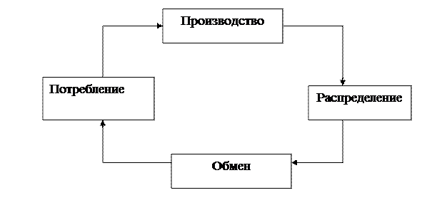 Как известно, вещество на земле совершает круговорот: повторяются процессы превращения и перемещения вещества в природе. Подобно этому общественное богатство находится в циклическом движении. Оно движется по такой траектории: производство — распределение — обмен — потребление. Производство — процесс создания полезного продукта. В это время работники приспосабливают вещество и силы природы к удовлетворению общественных потребностей (скажем, выплавляют из железной руды чугун и сталь, изготавливают из древесины мебель и т. д.). Эта фаза экономики имеет решающее значение. Ведь если блага не созданы, то нечего распределять, обменивать и потреблять. Распределение выявляет долю каждого человека в произведенном богатстве, которая зависит в первую очередь от количества изготавливаемых благ. Доставшиеся при распределении продукты зачастую нельзя израсходовать для личного потребления, поскольку люди нуждаются в совершенно иных благах. Тогда происходит обмен - процесс, во время которого одни вещи обмениваются на другие, нужные для человека. Потребление означает использование изготовленных благ для удовлетворения человеческих потребностей. Полезные продукты исчезают в процессе потребления, поэтому их требуется снова создавать (рис. 3).