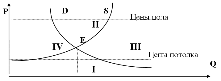 Совместим кривые спроса и предложения. Полученная точка пересечения E – точка равновесия, где P1 —равновесная цена, а Q1 – равновесный объем. Всю координатную плоскость кривые D и S делят на четыре различные зоны, которые можно описать следующим образом: I – зона возможных покупок, но невозможных продаж (дефицит); II – зона возможных продаж, но невозможных покупок (излишек); III – зона невозможных покупок и продаж (мертвая зона); IV – зона наиболее благоприятных сделок. При вмешательстве государства в установление цен говорят о политическом ценообразовании. Цена потолка – максимальная цена дает ожидаемый результат только в случае, если она ниже равновесной. Она служит для защиты потребителей и создает, как правило, превышение спроса над предложением и образование «черного рынка». Цена пола – минимальная цена, которая служит для защиты производителей и создает превышение предложения над спросом. Она имеет смысл только тогда, когда выше равновесной. Однако стремление производителей в условиях перепроизводства (например, сельхозпродукции) избавиться от товара ведет к образованию «серого рынка».