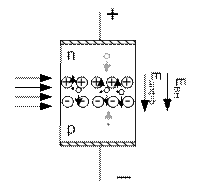 Устройство фотодиода: p-n переход одной стороной обращен к стеклянному окну, через которое поступает свет, и защищен от воздействия света с других сторон.