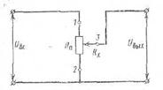 К крайним выводам резистивного элемента (точки 1 и 2) приложено напряжение питания U BХ. Выходное напряжение U ВЫХ снимается с участка между подвижным контактом 3 и одним из крайних выводов (точка 1 или 2). При ненагруженном потенциометре величина U ВЫХ определяется по формуле